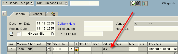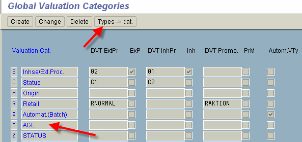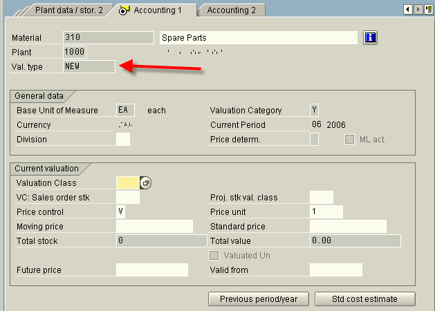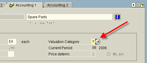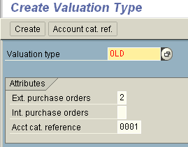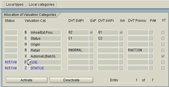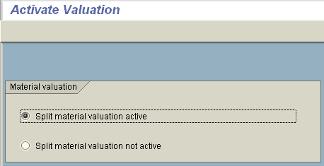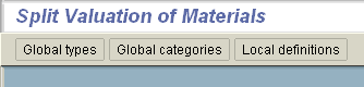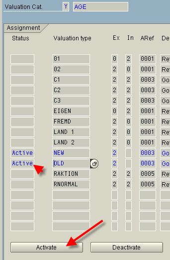 The valuation typs are grouped together in a valuation category. So for example, the above valuation types could be grouped by age, country, color. A material is activated by entering the valuation type in the accounting view of the material master.