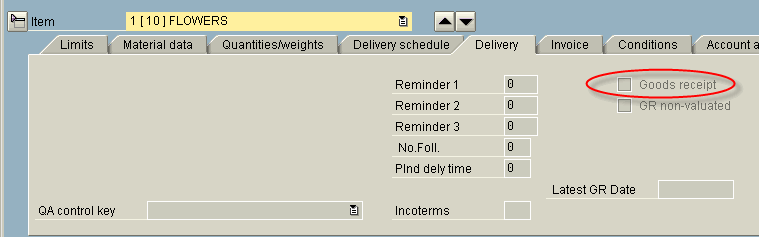 Because no Goods Receipt (GR) will take place, the GR indicator is switched off when the item category is selected.