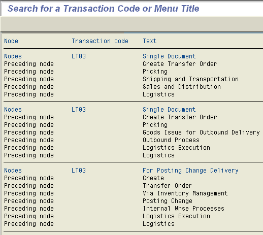 In this case, the same transaction can be found at a few places in the SAP Menu . Read entries from the bottom up. Example, the menu path of first entry is: Logistics > Sales & Distribution > Shipping and Transportation > Picking > Create Transfer Order > Single