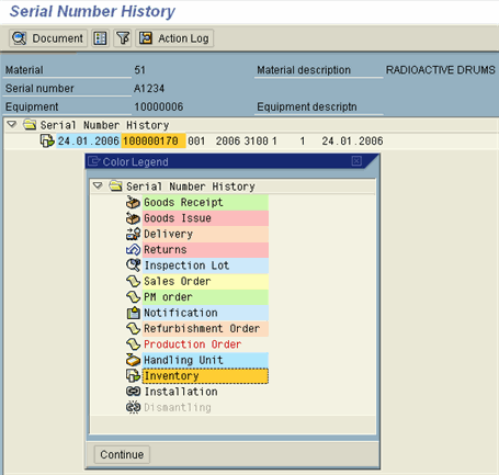 History of all inventory management transactions related to this serial number are visible by hitting the ‘History’ button